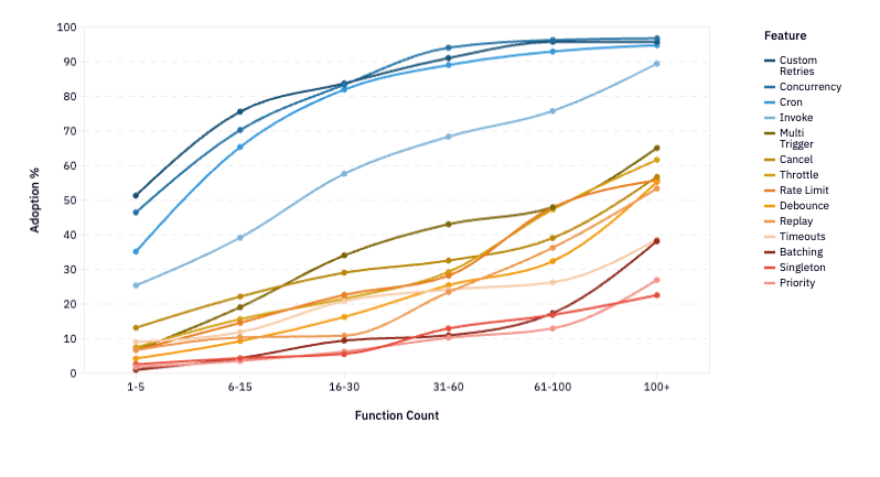 If you squint, you can see 3 groups of features that move together at a similar rate of adoption. (Reminder: I’m skipping over the SDK primitives that exist in nearly 100% of Inngest deployments on Day 1. That’s why the highest starting feature adoption metric you’ll see is 52%—there’s still lots everyone can do on Day 1).