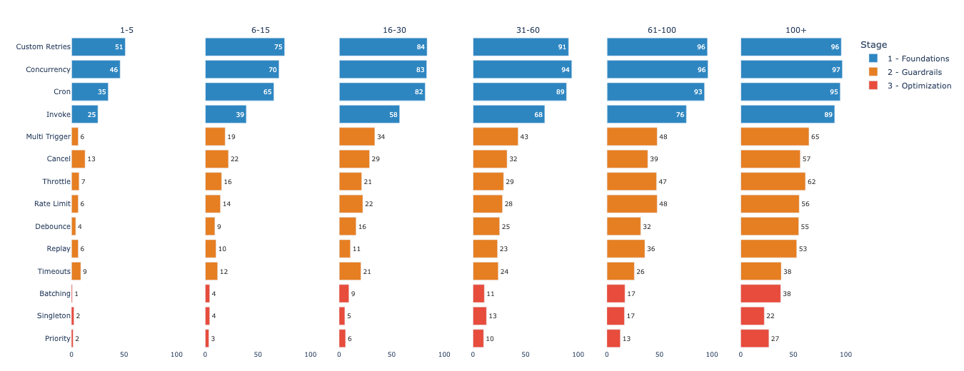 After looking at 50,000 of our most active users, three tiers of platform maturity emerged: Foundational Reliability, Guardrails, and Optimization. Before you ask… no, “maturity” is not a measure of how much users pay us. Maturity here is a mix of time on platform, number functions, and number of deploys. What I found is a pretty clean delineation of use cases that ranged from table stakes configuration primitives (retries, sleep), to those that only really present at a certain scale (debounce, prioritization).