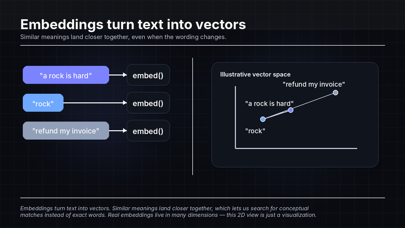 In simple terms, an embedding turns a piece of text into a long list of numbers: a vector. You can think of that vector as a point in mathematical space. If you embed "a rock is hard" and then embed "rock," those two points will usually end up closer together than either one would be to something unrelated like "refund my invoice."
