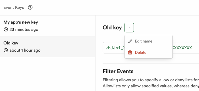 In the event key list, select your old key and in the 3-dot menu next to the key name, click "Delete"